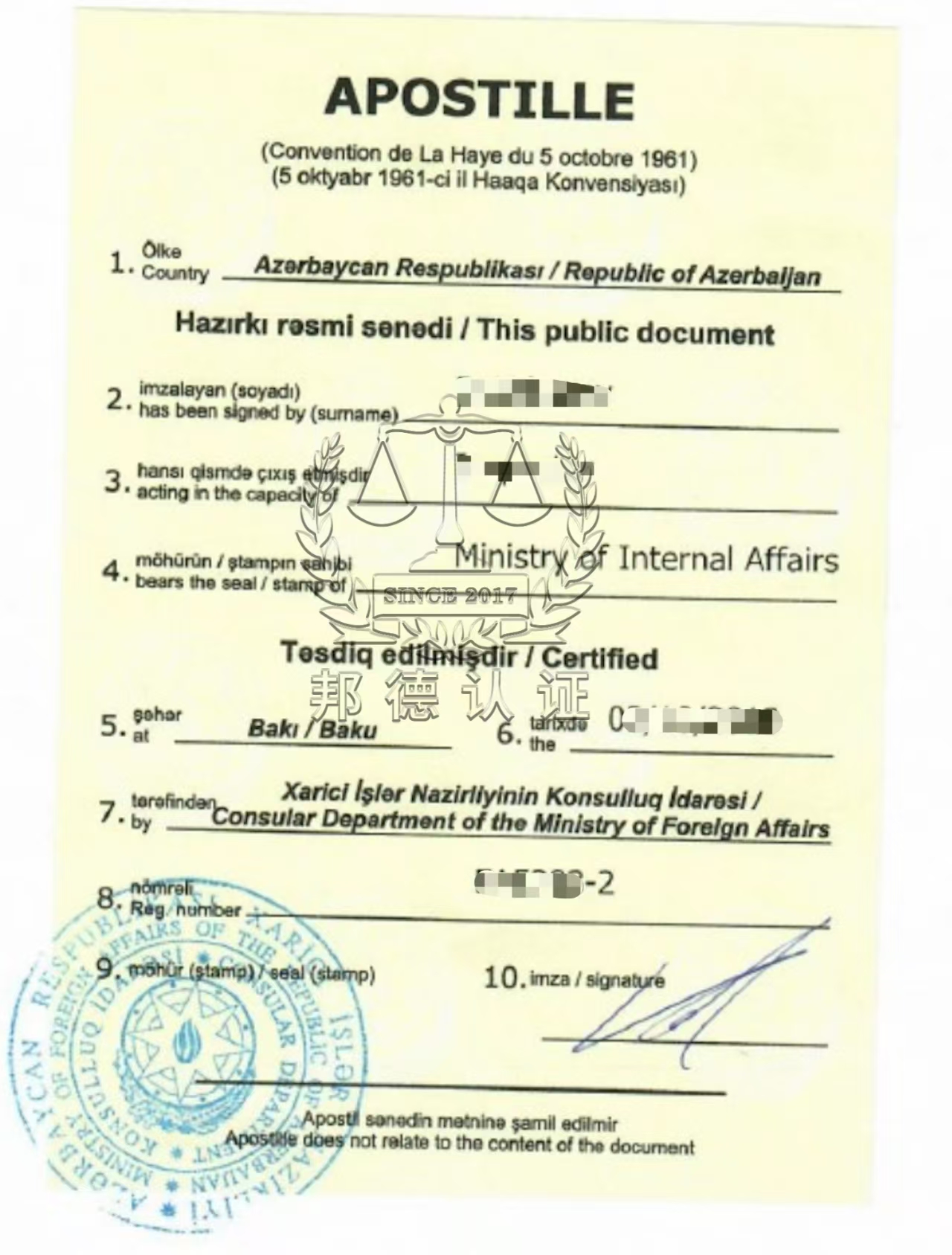 阿塞拜疆共和国(Republic of Azerbaijan)位于欧亚大陆交界处的外高加索地区东部,被誉为“火的国家”。它是古丝绸之路的重要驿站,拥有深厚的历史底蕴与现代化的石油工业。阿塞拜疆于2005年3月加入《海牙公约》的缔约国,因此阿塞拜疆的文件用在中国或其他海牙成员国,只需办理阿塞拜疆海牙认证(附加证明书,Apostille)即可,无需再进行繁琐的领事馆双认证,但是用在未加入海牙国使用时,仍需办理目的国的领事认证。