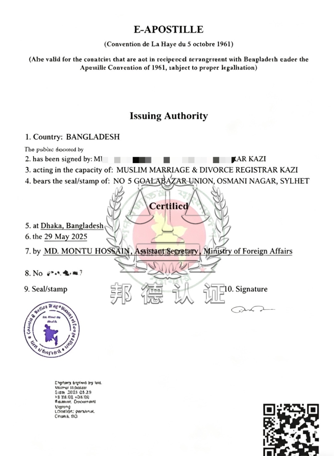 孟加拉国于2025年3月正式加入海牙成员国, 中国与孟加拉国之间的文书往来均已适用海牙认证流程,无需再办理领事认证, 孟加拉国已推出了 e-Apostille(电子海牙认证)系统,支持在线验证和 QR 码查询,极大简化了认证流程,无需再进行繁琐的领事馆双认证,但若文件用在未加入海牙国使用时,仍需办理目的国的领事认证。