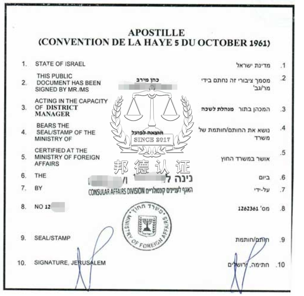以色列于1978年8月加入《海牙公约》的缔约国,因此以色列的文件用在其他海牙成员国,只需办理以色列海牙认证(Israel Apostille)即可,无需再进行繁琐的领事馆双认证。